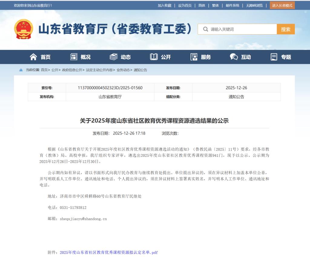 近日,山东省教育厅公示2025年度山东省社区教育优秀课程资源拟认定名单中,劳动经济系婴幼儿托育服务与管理专业申报的《沿着黄河讲非遗》(主持人:郑雯)、《家园共育小课堂:幼儿入园适应能力培养》(主持人:李晓琦)两门课程成功入选,充分彰显了在托育专业建设与社区教育服务领域的扎实功底和创新能力。