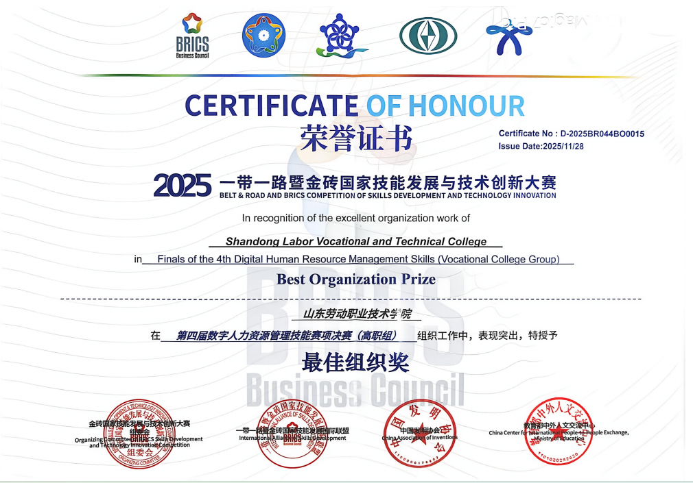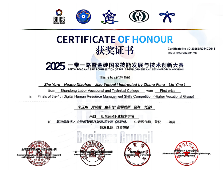 近日,2025年第九届一带一路暨金砖国家技能发展与技术创新大赛第四届数字人力资源管理技能赛项全国总决赛近日圆满落幕。山东劳动职业技术学院劳动经济系24级朱玉如、黄筱涵、焦咏琦三位同学组成的参赛团队,凭借扎实的专业功底,从全国160支参赛队伍中脱颖而出,一举夺得高职组全国一等奖的优异成绩。山东劳动职业技术学院荣获最佳组织奖。
