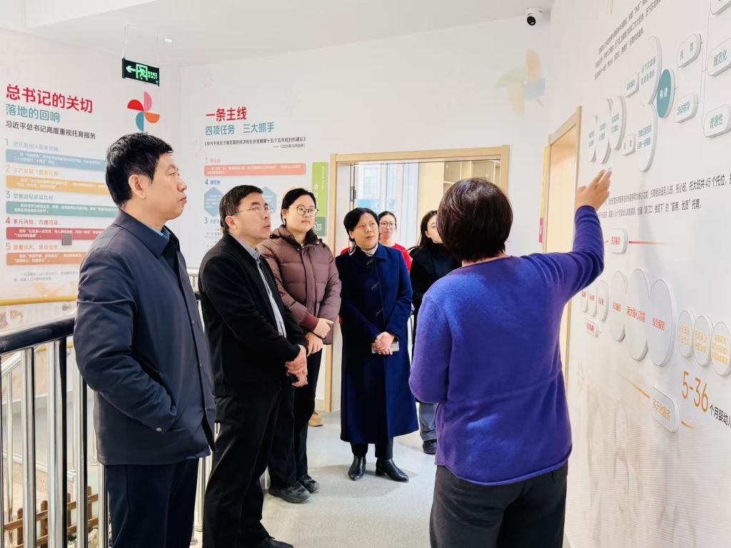 在园区负责人的指引下,一行人走访了托育中心的婴幼儿活动教室、营养膳食厨房、向日葵亲子小屋等功能区域,详细了解了环境创设、设施配置、班级管理及日常照护流程。双方就托育机构的运营模式、岗位设置与服务规范等内容进行了现场交流。