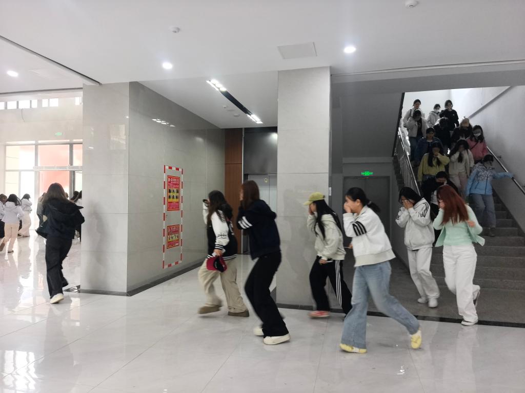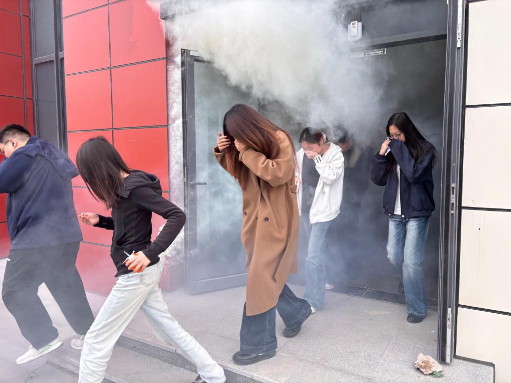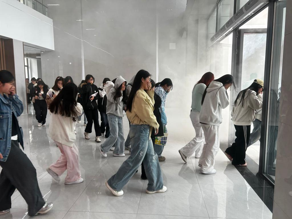 结合7号教学楼新楼布局特点,在演练之前,老师们科学规划逃生路线及集结地点,明确各逃生出口负责人及具体岗位职责,修定完善《7号教学楼消防应急疏散逃生演练方案》,细化演练流程、压实工作责任,为演练活动的顺利开展筑牢基础。演练启动后,专职辅导员、学生干部及消防志愿者迅速到位,分赴七号楼各楼层、各出入口,有序引导师生弯腰捂鼻,严格按指定路线快速疏散,全程做到安全、规范、高效、确保无一人遗漏、无安全隐患。