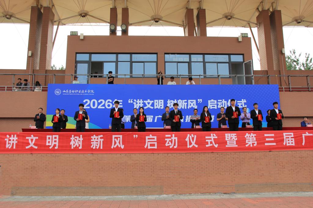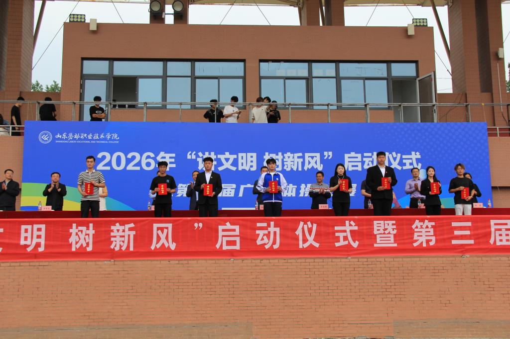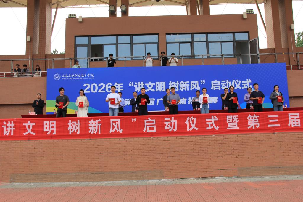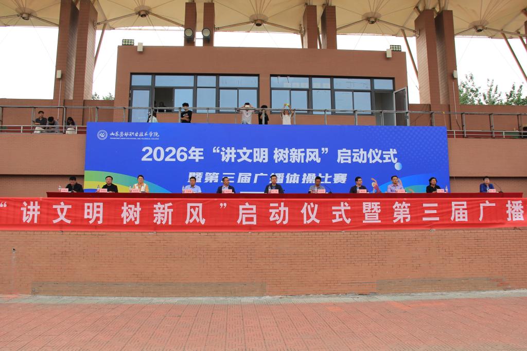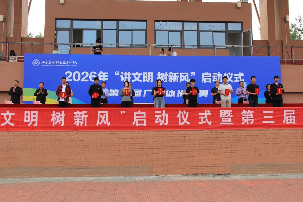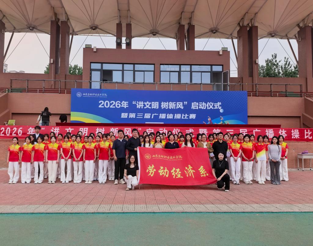 为深入推进校园精神文明建设,涵养优良校风学风,丰富校园文体生活,4月15日下午,山东劳动职业技术学院2026年“讲文明 树新风”启动仪式暨第三届广播体操比赛在长清校区体育场隆重举行,学院8支代表队同台竞技。劳动经济系党总支书记林蓉、全体辅导员及学生代表观赛助威。参赛队员们在激烈的角逐中脱颖而出,荣获比赛第二名。